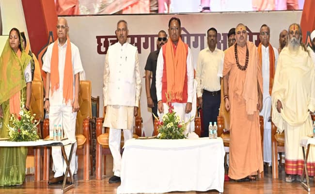 वैदिक मंत्रोच्चार के साथ राजधानी रायपुर के दीनदयाल उपाध्याय ऑडिटोरियम में आयोजित गरिमामयी समारोह में मुख्यमंत्री श्री साय ने संतों का अभिवादन कर उनका आशीर्वाद प्राप्त किया।