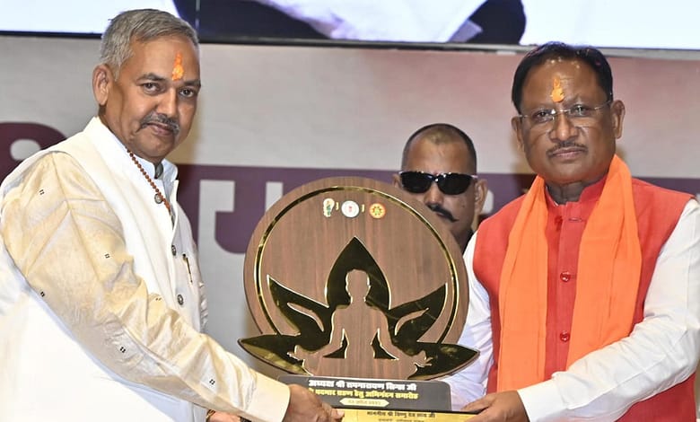 वैदिक मंत्रोच्चार के साथ राजधानी रायपुर के दीनदयाल उपाध्याय ऑडिटोरियम में आयोजित गरिमामयी समारोह में मुख्यमंत्री श्री साय ने संतों का अभिवादन कर उनका आशीर्वाद प्राप्त किया।