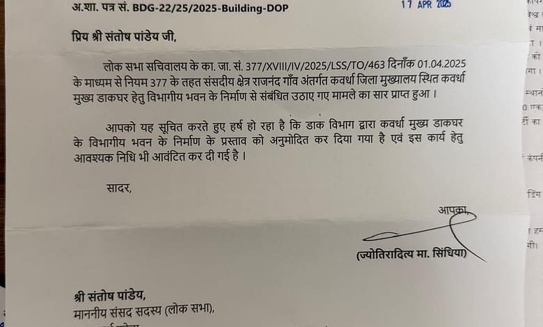 कवर्धा / राजनांदगांव लोकसभा क्षेत्र के सांसद संतोष पांडेय का प्रयास रंग लाया है। सांसद पांडेय के प्रयास व मांग से कवर्धा में डाकघर के भवन निर्माण हेतु केंद्र सरकार ने स्वीकृति प्रदान कर दी है। केंद्रीय संचार एवं उत्तर पूर्वी क्षेत्र विकास मंत्रालय ने इस संबंध में पत्र जारी कर दिया है।