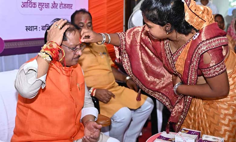 मुख्यमंत्री विष्णु देव साय के गृह ग्राम बगिया स्थित कैंप कार्यालय में रक्षाबंधन के अवसर पर विभिन्न योजनाओं से लाभान्वित बहनों ने राखी बांधकर आभार व्यक्त किया। प्रधानमंत्री आवास योजना, महतारी वंदन योजना की हितग्राही दीदियों के साथ आंगनबाड़ी कार्यकर्ता-सहायिकाएँ, मितानिन और स्व-सहायता समूह की बहनों ने भी मुख्यमंत्री श्री साय की कलाई पर राखी बांधी और उनके दीर्घायु की कामना की।