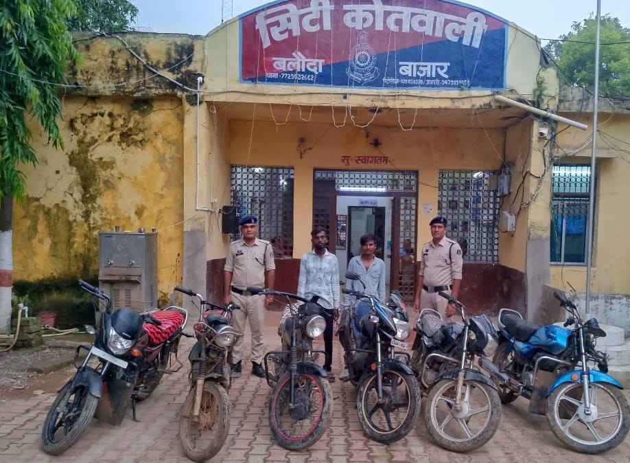 बलौदाबाजार।सिटी कोतवाली पुलिस नेमोटरसाइकिल चोरी की घटनाओं का पर्दाफाश करते हुए तीन आरोपियों को गिरफ्तार किया है, जिनमें एक नाबालिक भी शामिल है। पुलिस ने इनके कब्जे से 06 चोरी की गई मोटरसाइकिलें बरामद की हैं।