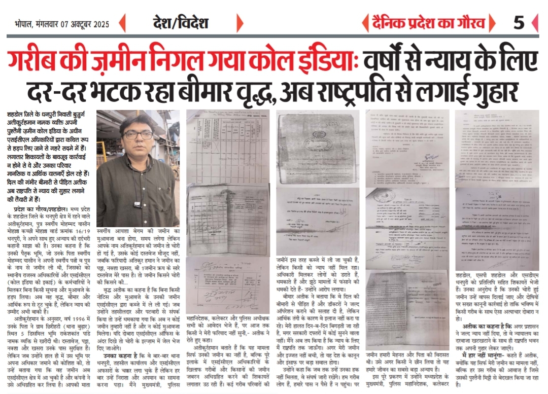 शहडोल जिले के धनपुरी निवासी बुजुर्ग अतीकुर्रहमान नामक व्यक्ति अपनी पुश्तैनी ज़मीन कोल इंडिया के अधीन एसईसीएल अधिकारियों द्वारा कथित रूप से हड़प लिए जाने से गहरे सदमे में हैं। लगातार शिकायतों के बावजूद कार्रवाई न होने से वे और उनका परिवार मानसिक व आर्थिक यातनाएँ झेल रहे हैं। दिल की गंभीर बीमारी से पीड़ित अतीक अब राष्ट्रपति से न्याय की गुहार लगाने की तैयारी में हैं।