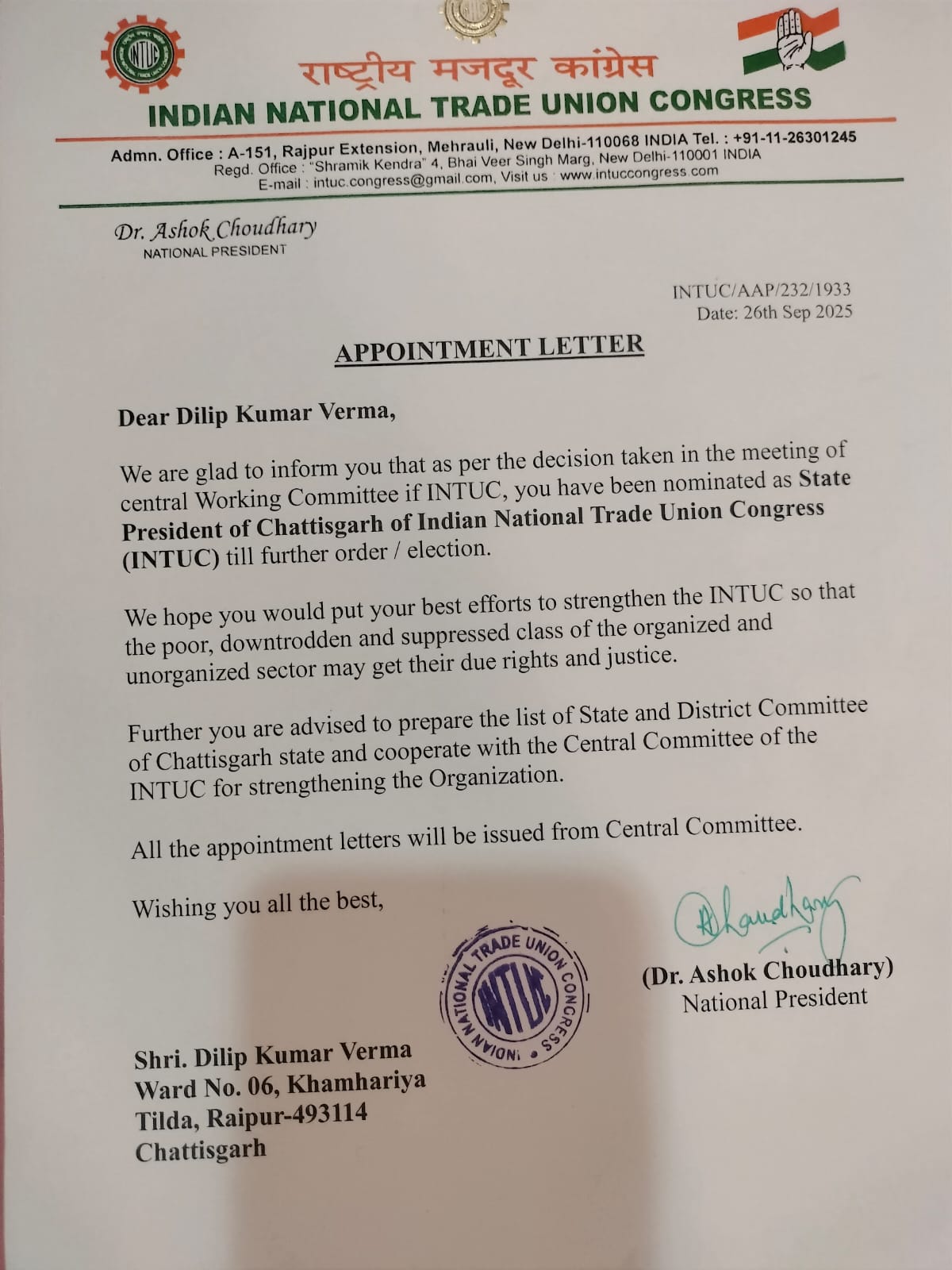 राष्ट्रीय मजदूर कांग्रेस (इंटक) के राष्ट्रीय अध्यक्ष अशोक चौधरी ने दिलीप कुमार वर्मा को छत्तीसगढ़ प्रदेश अध्यक्ष की जिम्मेदारी सौंपी है।