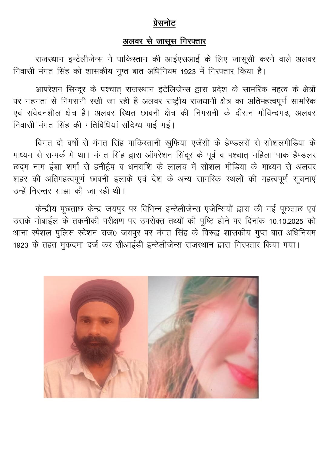 Rajasthan News:राजस्थान इंटेलिजेंस ने अलवर के रहने वाले मंगत सिंह को पाकिस्तानी खुफिया एजेंसी ISI के लिए जासूसी करने के आरोप में गिरफ्तार किया है. उसके खिलाफ शासकीय गोपनीयता अधिनियम 1923 के तहत मामला दर्ज किया गया है. बताया जा रहा है कि अलवर के छावनी क्षेत्र में निगरानी के दौरान, गोविंदगढ़, अलवर निवासी मंगत सिंह की गतिविधियां संदिग्ध पाई गईं. मंगत सिंह को कथित तौर पर ईशा शर्मा नाम की एक पाकिस्तानी महिला हैंडलर ने हनीट्रैप में फंसाया था, जिसने सहयोग के बदले उसे पैसे देने की पेशकश की थी. मंगत सिंह के खिलाफ गुरुवार को जयपुर स्थित विशेष पुलिस स्टेशन में शासकीय गोपनीयता अधिनियम 1923 के तहत मामला दर्ज किया गया और सीआईडी इंटेलिजेंस राजस्थान ने उसे गिरफ्तार कर लिया.