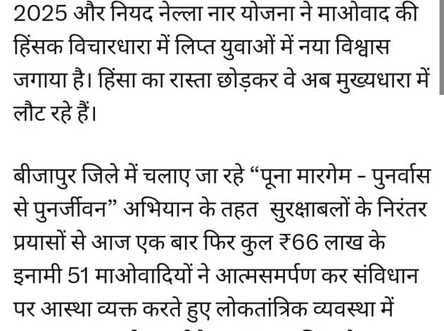 मुख्यमंत्री श्री साय ने कहा कि बीजापुर जिले में “पूना मारगेम – पुनर्वास से पुनर्ज़ीवन” अभियान के तहत आज सुरक्षा बलों के निरंतर प्रयासों से कुल ₹66 लाख के इनामी 51 माओवादियों ने आत्मसमर्पण किया है। इन सभी ने संविधान पर आस्था व्यक्त करते हुए लोकतांत्रिक व्यवस्था में सम्मानजनक जीवन जीने का संकल्प लिया है।