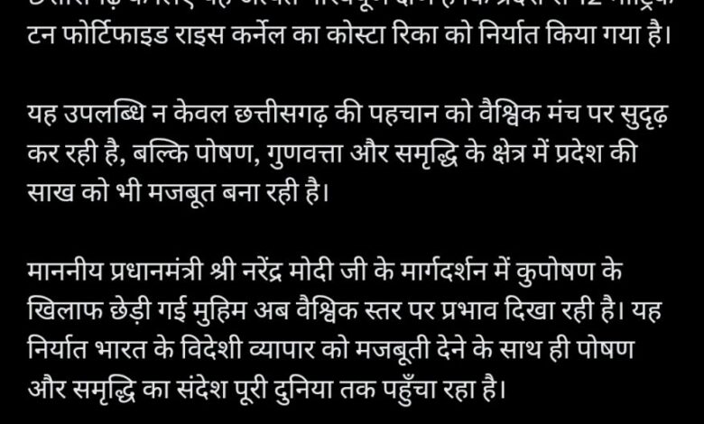 उल्लेखनीय है कि केंद्रीय वाणिज्य एवं उद्योग मंत्री श्री पीयूष गोयल ने सोशल मीडिया हैंडल पर पोस्ट करके जानकारी दी है कि छत्तीसगढ़ से 12 मीट्रिक टन फोर्टिफाइड राइस कर्नेल की पहली खेप कोस्टा रिका के लिए निर्यात की गई है।उन्होंने कहा कि प्रधानमंत्री श्री नरेंद्र मोदी जी के कुपोषण के खिलाफ अभियान को आगे बढ़ाते हुए यह वैश्विक स्तर पर किया गया प्रयास न केवल हमारे विदेशी व्यापार को सशक्त करता है, बल्कि हमारे पोषण मिशन को भी नई ऊर्जा प्रदान करता है।यह पहल हमारे किसानों, मिल संचालकों और निर्यातकों को नए बाजार, बेहतर मूल्य प्राप्ति और मूल्यवर्धित कृषि उत्पादों के निर्यात को बढ़ावा देने के अवसर प्रदान करती है।