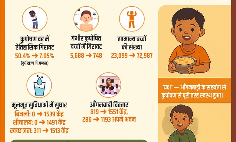 रायपुर: महिला एवं बाल विकास विभाग द्वारा दुर्ग जिले में पिछले 25 वर्षों में अविस्मरणीय उपलब्धि हासिल की गई है, जिसने ज़िले के बाल स्वास्थ्य परिदृश्य को पूरी तरह से बदल दिया है। शासन की महत्वाकांक्षी योजनाओं के क्रियान्वयन तथा विभाग की अथक मेहनत का परिणाम है कि दुर्ग ज़िले में कुपोषण की दर राज्य में सबसे कम है। यह सफलता कई बच्चों को कुपोषण के अँधेरे से निकालकर सुपोषण के उजाले की ओर ले जाने की एक प्रेरक गाथा है।