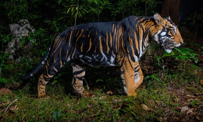 ऐसे होते हैं मेलानिस्टिक टाइगर मेलानिस्टिक टाइगर के शरीर पर चौड़ी और मोटी काली धारियां होती हैं। ये धारियां गहरी और फैली हुई होती हैं जिससे बाघ पूरी तरह ब्लैक नजर आता है। सामान्य रूप से टाइगर के शरीर पर येलो या चॉकलेटी रंग की धारियां नजर आती है।