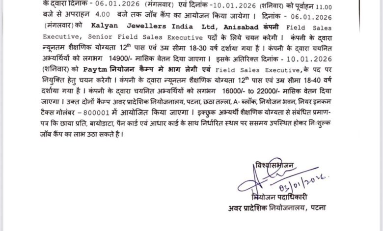 पटना : बिहार सरकार के युवा, रोजगार एवं कौशल विकास विभाग के अंतर्गत अवर प्रादेशिक नियोजनालय, पटना द्वारा बेरोजगार युवाओं के लिए दो दिवसीय जॉब कैंप का आयोजन किया जा रहा है। यह जॉब कैंप 06 जनवरी 2026 (मंगलवार) एवं 10 जनवरी 2026 (शनिवार) को पूर्वाह्न 11:00 बजे से अपराह्न 4:00 बजे तक आयोजित होगा।