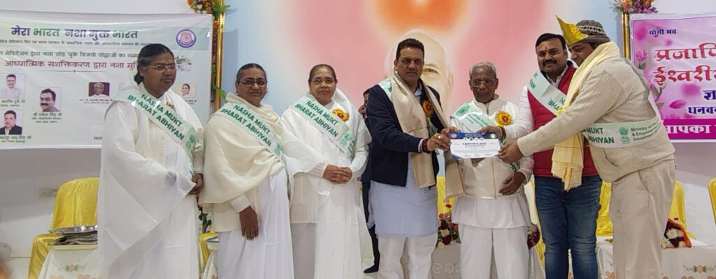 भारत सरकार के सामाजिक न्याय और अधिकारिता मंत्रालय द्वारा संचालित ‘नशा मुक्त भारत अभियान’ (NMBA) में आध्यात्मिक संस्था ब्रह्माकुमारीज़ के सहयोग से एक बड़ी सफलता देखने को मिल रही है। इसी क्रम में प्रजापिता ब्रह्मा कुमारी ईश्वरीय विश्व विद्यालय शिव स्मृति भवन नेपियर टाउन जबलपुर के सौजन्य से ज्ञान संजीवनी भवन राजयोग मेडिटेशन के अभ्यास से नशे की गंभीर गिरफ्त में लोगों ने न केवल नशा छोड़ा है, बल्कि एक खुशहाल जीवन की शुरुआत भी की है। इस कार्यक्रम में जबलपुर के महापौर भ्राता जगत बहादुर सिंह अन्नू, विधायक भ्राता अभिलाष पांडेय, विधायक भ्राता नीरज सिंह, भ्राता सांसद आशीष दुबे,डॉ श्याम जी रावत, डॉ लखन वैश्य, राजयोगिनी बी के हेमलता इंदौर जोन सेवाकेंद्र संचालिका, राजयोगिनी बी के. कुसुम संचालिका नरसिंहपुर, राजयोगिनी बी के भावना , बी के उषा समेत कई गणमान्य उपस्तिथ रहें।
