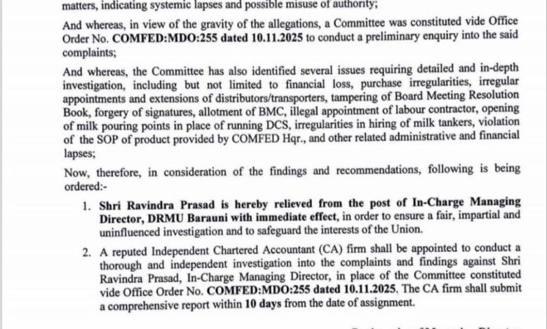 बेगूसराय: सुधा डेयरी के मैनेजिंग डायरेक्टर पर गंभीर आरोप,तत्काल प्रभाव से हटाया