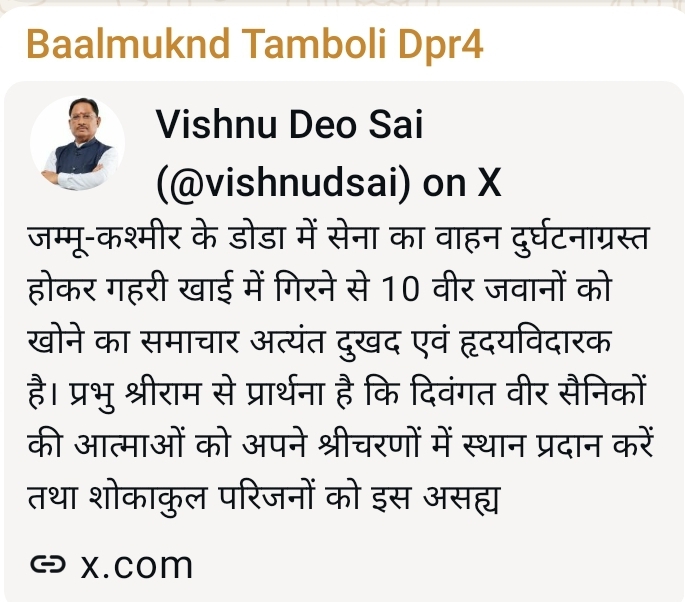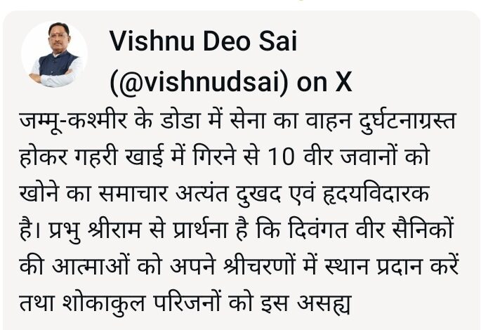 जम्मू-कश्मीर के डोडा में सेना वाहन दुर्घटना पर मुख्यमंत्री विष्णु देव साय ने जताया गहरा शोक