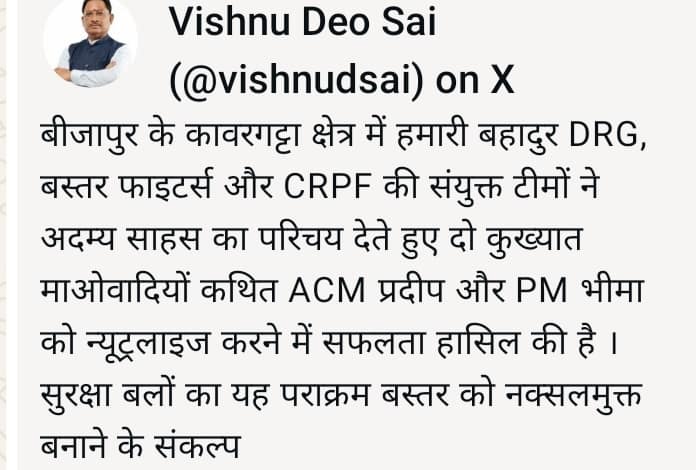 मुख्यमंत्री श्री विष्णु देव साय ने कहा कि हमारी बहादुर डीआरजी, बस्तर फाइटर्स एवं सीआरपीएफ की संयुक्त टीमों ने अदम्य साहस और उत्कृष्ट रणनीति का परिचय देते हुए दो कुख्यात माओवादियों — कथित एरिया कमांडर प्रदीप (ACM) एवं पार्टी मेंबर भीमा (PM) — को न्यूट्रलाइज करने में सफलता हासिल की है।