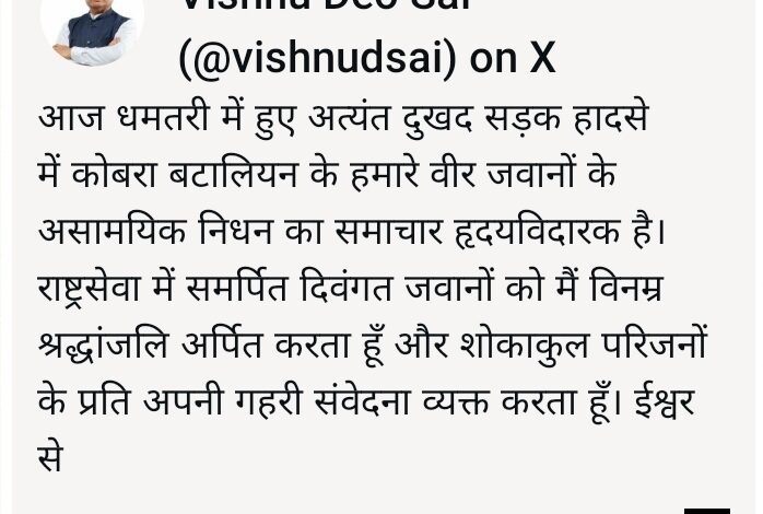 रायपुर 14 फरवरी 2026/ मुख्यमंत्री श्री विष्णु देव साय ने आज धमतरी में हुए सड़क हादसे में कोबरा बटालियन के वीर जवानों के असामयिक निधन पर गहरा शोक व्यक्त किया है। उन्होंने कहा कि राष्ट्रसेवा में समर्पित हमारे जांबाज जवानों का निधन अत्यंत हृदयविदारक है और यह क्षति अपूरणीय है।