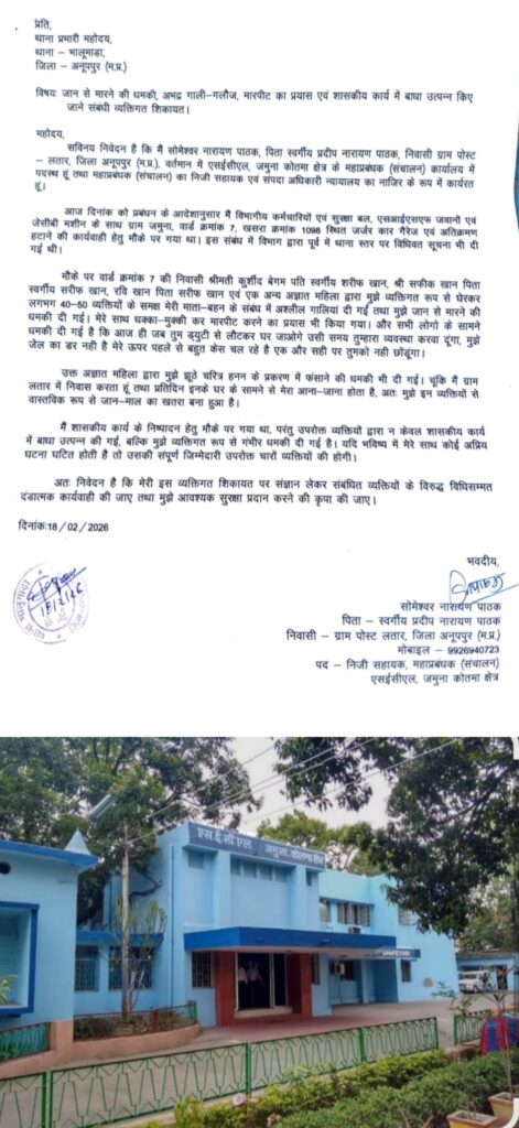 भालूमाड़ा (अनूपपुर) |मोहम्मद असलम बाबा सरकारी जमीन से अतिक्रमण हटाना एक प्रशासनिक अधिकारी को भारी पड़ गया। जमुना क्षेत्र के वार्ड क्रमांक 7 में अतिक्रमण विरोधी कार्रवाई के दौरान न केवल शासकीय कार्य में बाधा डाली गई, बल्कि ड्यूटी पर तैनात अधिकारी को सरेआम मां-बहन की भद्दी गालियां देते हुए जान से मारने की धमकी दी गई। मामला SECL जमुना कोतमा क्षेत्र के महाप्रबंधक (संचालन) के निज सहायक एवं संपदा अधिकारी सोमेश्वर नारायण पाठक से जुड़ा है, जिन्होंने अब भालूमाड़ा थाना पुलिस से अपनी जान की सुरक्षा की गुहार लगाई है।