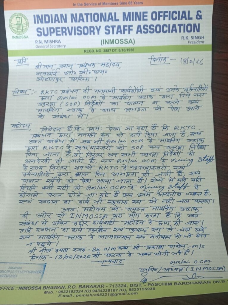 धनबाद/बराकर। इंडियन नेशनल माइन ऑफिशियल एंड सुपरवाइजरी स्टाफ एसोसिएशन (इनमोसा) ने आरकेटीसी प्रबंधन पर गंभीर आरोप लगाते हुए कहा है कि खदान क्षेत्र में सुरक्षा मानकों (एसओपी) की खुली अनदेखी की जा रही है। संगठन ने इस संबंध में महाप्रबंधक को पत्र भेजकर तत्काल हस्तक्षेप और कठोर कार्रवाई की मांग की है।