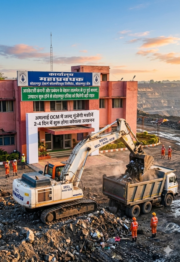 धनपुरी | विशेष संवाददाता असलम बाबा एसईसीएल सोहागपुर एरिया की सबसे महत्वाकांक्षी और रणनीतिक रूप से महत्वपूर्ण परियोजना ‘अमलाई ओपन कास्ट माइंस’ (OCM) के माथे से आखिरकार अनिश्चितता के बादल छंट गए हैं। लंबे समय से जिस घड़ी का इंतजार कोयलांचल की जनता और प्रबंधन को था, वह अब दस्तक दे चुकी है। तकनीकी खामियों और व्यवस्थागत अड़चनों की दीवार को अपनी अदम्य इच्छाशक्ति से ढहाते हुए, सोहागपुर प्रबंधन और आरकेटीसी कंपनी के बीच हुए बेमिसाल तालमेल ने विरोधियों और बाधाओं को शांत कर दिया है। अगले 2 से 4 दिनों के भीतर खदान की गहराइयों से काला सोना (कोयला) निकलने का सिलसिला विधिवत शुरू हो जाएगा। यह केवल उत्पादन की शुरुआत नहीं, बल्कि सोहागपुर एरिया के वर्चस्व की पुनर्स्थापना है।