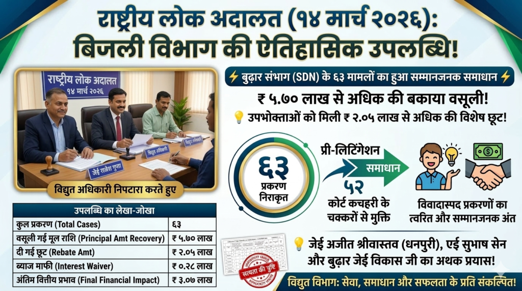 लोक अदालत में बिजली विभाग की बड़ी उपलब्धि: बुढ़ार, जैतपुर और धनपुरी में 63 प्रकरणों का हुआ निपटारा