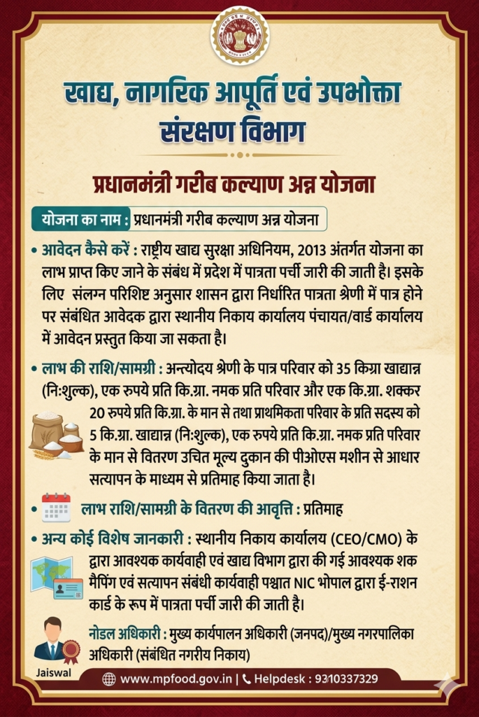शहडोल | असलम बाबा (ब्यूरो) खाद्य, नागरिक आपूर्ति एवं उपभोक्ता संरक्षण विभाग ने ‘प्रधानमंत्री गरीब कल्याण अन्न योजना’ के तहत पात्र परिवारों को बड़ी राहत दी है। अब राशन कार्ड (पात्रता पर्ची) बनवाने के लिए हितग्राहियों को जिला मुख्यालय या बड़े दफ्तरों के चक्कर नहीं काटने होंगे। शासन ने आवेदन की प्रक्रिया का विकेंद्रीकरण करते हुए इसे सीधे स्थानीय निकायों— ग्राम पंचायत, जनपद और नगरीय वार्ड कार्यालयों से जोड़ दिया है। यानी अब आपके घर के पास ही आवेदन जमा होंगे और वहीं से डिजिटल पात्रता पर्ची जारी की जाएगी।