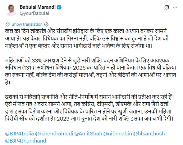 रांची (SHABD ) :झारखंड में भी नारी शक्ति वंदन अधिनियम को अमलीजामा पहनाने में नाकामी पर आधी आबादी मायूस है। नेता प्रतिपक्ष बाबूलाल मरांडी ने भी इस विषय पर विपक्ष को घेरा है। उन्होंने एक सोशल मीडिया पोस्ट के जरिए कहा कि यह केवल विधेयक का गिरना नहीं, बल्कि उस विश्वास का टूटना है जो देश की महिलाओं ने एक बेहतर और समान भागीदारी वाले भविष्य के लिए संजोया था। श्री मरांडी ने कहा कि दशकों से महिलाएं राजनीति और नीति-निर्माण में समान भागीदारी की प्रतीक्षा कर रही हैं। ऐसे में जब यह अवसर सामने आया, तब कांग्रेस, टीएमसी, डीएमके और सपा जैसे दलों द्वारा इसका विरोध करना और विधेयक के पारित न होने पर खुशी जताना, उनकी महिला विरोधी सोच को दर्शाता है। एक अन्य सोशल मीडिया पोस्ट में उन्होंने सरकार की कार्यशैली पर सवाल उठाए। नेता प्रतिपक्ष ने कहा कि झारखंड में आईएएस और आईपीएस अधिकारियों की ट्रांसफर पोस्टिंग सामान्य प्रशासनिक प्रक्रिया नहीं, बल्कि सुव्यवस्थित वसूली उद्योग बन चुका है।