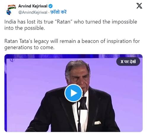 रतन टाटा के निधन से उद्योग जगत से लेकर देशभर में शोक की लहर है। आम आदमी पार्टी के राष्ट्रीय संयोजक और दिल्ली के पूर्व मुख्यमंत्री अरविंद केजरीवाल ने रतन टाटा के जाने पर दुख जताया है। अरविंद केजरीवाल ने सोशल मीडिया प्लेटफोर्ट "X" पर लिखा कि भारत ने अपना सच्चा 'रत्न' खो दिया। उन्होंने असंभव को संभव बनाया। रतन टाटा की विरासत आने वाली पीढ़ियों के लिए प्रेरणा का स्रोत बनी रहेगी।