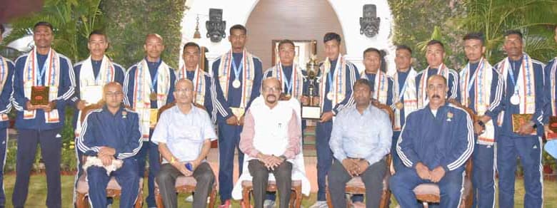 राज्यपाल श्री रमेन डेका से 27वीं अखिल भारतीय वन खेलकूद प्रतियोगिता में भाग लेने वाले असम के फुटबॉल टीम के खिलाडियों ने श्री सनीदेव चौधरी, (आईएफएस) और श्री तेजस एम, (आईएफएस) के नेतृत्व में सौजन्य मुलाकात की। उनके साथ टीम कोच श्री दगंता बोरा भी उपस्थित थे। उल्लेखनीय है कि असम की टीम ने इस प्रतियोगिता में पहली बार फुटबॉल में स्वर्ण पदक प्राप्त किया है।