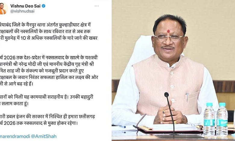 गरियाबंद जिले में जारी नक्सली मुठभेड़ में जवानों को मिली सफलता को मुख्यमंत्री विष्णुदेव साय ने सराहा है. सीएम साय ने सोशल मीडिया पर पोस्ट कर कहा किगरियाबंद जिले के मैनपुर थाना अंतर्गत कुल्हाड़ीघाट क्षेत्र में सुरक्षाबलों की नक्सलियों के साथ रविवार रात से अब तक जारी मुठभेड़ में 10 से अधिक नक्सलियों के मारे जाने की खबर है.