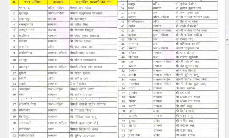 डॉक्टर विनय जायसवाल पिछली विधानसभा (2018-2023) में मनेंद्रगढ़ विधानसभा सीट से विधायक थे। उनकी पत्नी कंचन जायसवाल चिरमिरी नगर निगम से महापौर हैं। रायपुर नगर निगम में महापौर पद के लिए मैदान में उतरीं दीप्ति दुबे रायपुर नगर निगम के पूर्व महापौर और निवर्तमान अध्यक्ष प्रमोद दुबे की पत्नी हैं। पार्टी ने 40 नगर पालिका परिषदों और 102 नगर पंचायतों के अध्यक्ष पदों के लिए भी उम्मीदवारों की घोषणा की।
