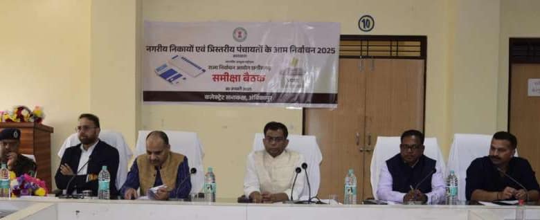 रायपुर : छत्तीसगढ़ राज्य निर्वाचन आयुक्त अजय सिंह नगरीय निकाय एवं त्रिस्तरीय पंचायतों के आम निर्वाचन 2025 के अंतर्गत मतदान पूर्व तैयारियों का जायजा लेने एक दिवसीय सरगुजा दौरे पर रहे। उन्होंने कलेक्ट्रेट सभाकक्ष में निर्वाचन के सम्बन्ध में जिले के वरिष्ठ अधिकारियों की बैठक लेकर आवश्यक दिशा निर्देश दिए। इस अवसर पर आयोग के सचिव डॉ सर्वेश्वर नरेंन्द्र भुरे एवं नोडल अधिकारी नगर पालिका एवं पंचायत निर्वाचन (पुलिस) ओ.पी. पाल भी उपस्थित थे ।