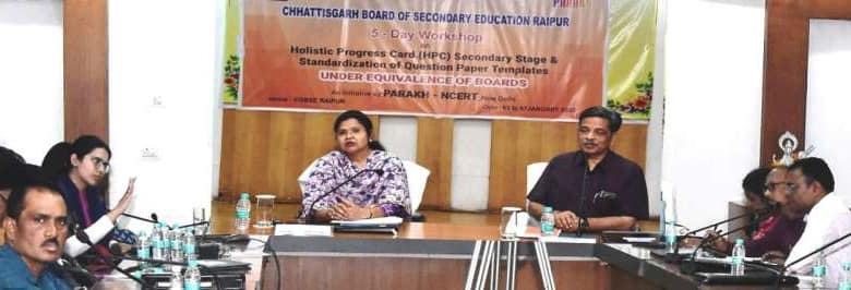 रायपुर : छत्तीसगढ़ माध्यमिक शिक्षा मंडल, रायपुर में राष्ट्रीय शिक्षा नीति 2020 के अंतर्गत एनसीईआरटी परख नई दिल्ली के निर्देशानुसार पाँच दिवसीय कार्यशाला सह प्रशिक्षण का शुभारंभ किया गया। इस कार्यक्रम का उद्देश्य होलिस्टिक प्रोग्रेस कार्ड और प्रश्न पत्र टेम्पलेट के मानकीकरण पर शिक्षकों को प्रशिक्षण प्रदान करना है। यह प्रशिक्षण आगामी शिक्षा सत्र में राज्य के सभी हाई एवं हायर सेकंडरी स्कूलों के प्राचार्यों व शिक्षकों को प्रशिक्षित करने के लिए मास्टर ट्रेनर्स तैयार करेगा।